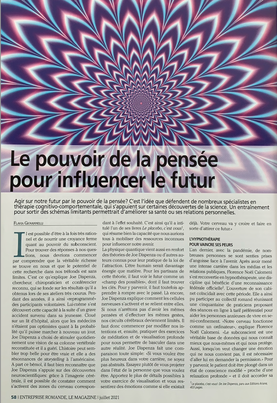 Un grand merci à Flavia Giovannelli, journaliste du magazine Entreprise romande pour son interview sur le sujet passionnant du pouvoir créateur de nos pensées. Une faculté que nous avons tous en nous et qui, aujourd’hui, est mise en avant par les scientifiques, dont le célèbre chercheur Joe Dispenza.